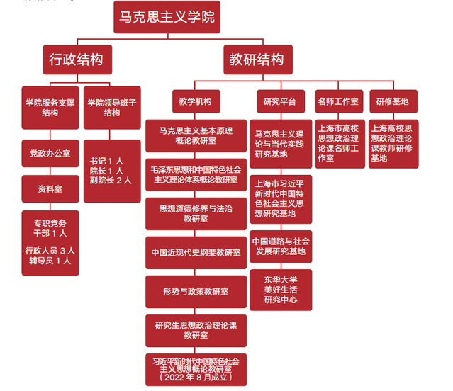 東華大學(xué)馬克思主義學(xué)院設(shè)有馬克思主義基本原理概論、習(xí)近平新時代中國特色社會主義思想概論、毛澤東思想和中國特色社會主義理論體系概論、思想道德與法治、中國近現(xiàn)代史綱要、形勢與政策、研究生思想政治理論課7個教研室和1個圖書資料室。 學(xué)院擁有6個教研平臺:一是馬克思主義理論與當(dāng)代實(shí)踐研究基地;二是上海市習(xí)近平新時代中國特色社會主義思想研究基地(東華大學(xué)基地);三是上海高校思想政治理論課教師研修基地;四是上海市高校思想政治理論課名師工作室;五是“中國道路與社會發(fā)展”研究基地;六是東華大學(xué)美好生活研究中心。