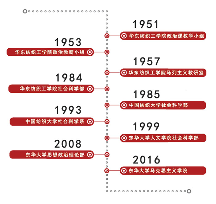 1951年10月,學(xué)校成立之初即設(shè)立政治課教學(xué)小組,歸屬公共課程部,開設(shè)社會發(fā)展史等馬列主義課程。1953年10月,政治課教學(xué)小組改名為政治教研小組,歸校政治輔導(dǎo)處領(lǐng)導(dǎo)。1957年5月,學(xué)校成立馬列主義教研室,直屬學(xué)校黨委領(lǐng)導(dǎo)。1980年2月,開設(shè)馬列主義基本原理課。從此,馬列主義理論教育開始走上了系統(tǒng)化和規(guī)范化進(jìn)程。1984年5月,學(xué)校撤銷馬列主義教研室,建立社會科學(xué)部。社會科學(xué)部下設(shè)哲學(xué)、政治經(jīng)濟(jì)學(xué)、中共黨史3個(gè)教研室和1個(gè)圖書資料室。1993年3月,學(xué)校將社會科學(xué)部改為社會科學(xué)系。1999年7月,社會科學(xué)系改制為人文學(xué)院,承擔(dān)馬克思主義理論教學(xué)的3個(gè)教研室和德育教研室共同組成社會科學(xué)部。2008年,設(shè)立東華大學(xué)思想政治理論部,成為相對獨(dú)立的二級機(jī)構(gòu)。2016年,成立東華大學(xué)馬克思主義學(xué)院,以學(xué)院建制進(jìn)行相關(guān)建設(shè)。